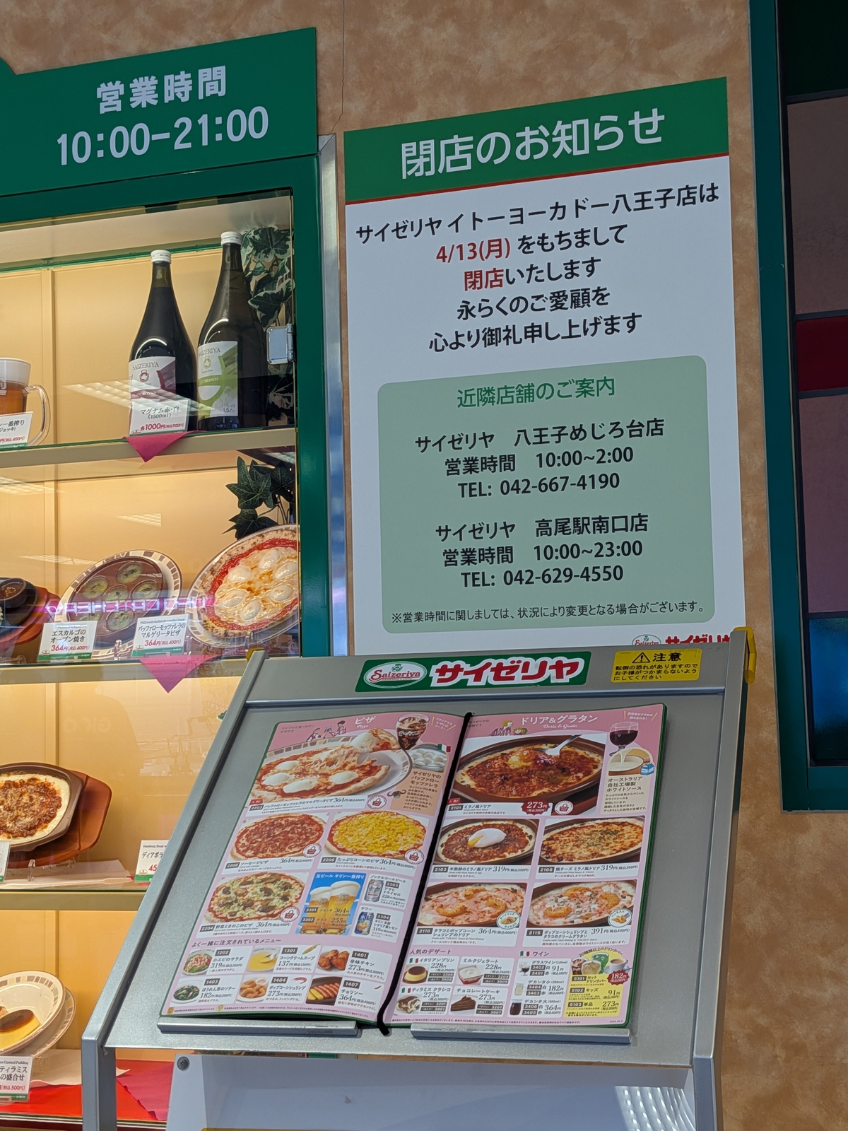 サイゼリヤは美味しい上に安いのでお気に入りのファミレスなんですが、ここのサイゼリヤは再来月の4月13日月曜日をもって閉店とのこと。残念です〜