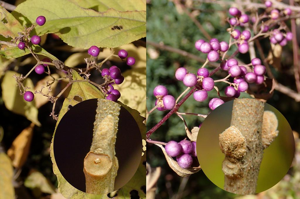 コムラサキ実は葉柄から離れている、冬芽は芽鱗に包まれ星状毛が密生する。園芸店ではこれをムラサキシキブと称する事が多い。ムラサキシキブは裸芽で粉の様な短毛が覆う。シロミノコムラサキ実も植栽されていた。