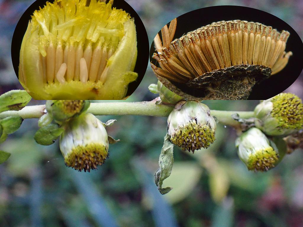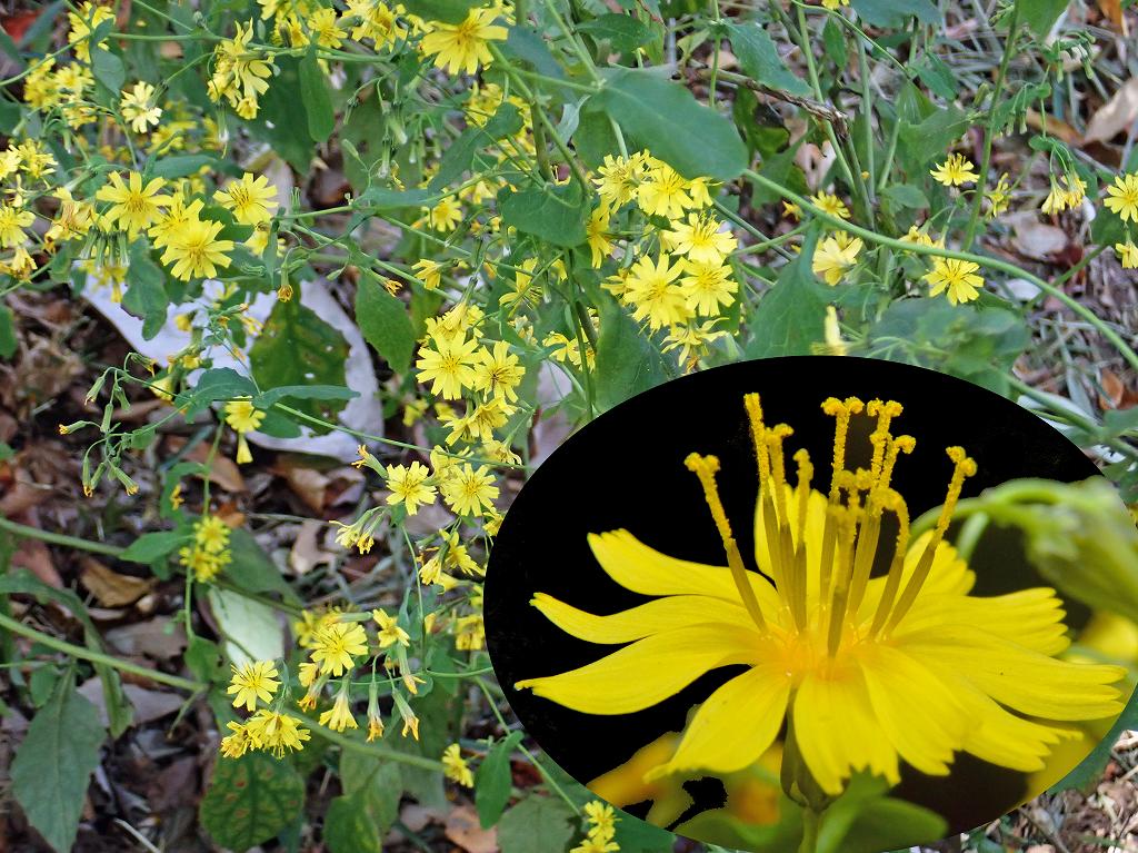 土手にはハルジオンのロゼット(葉柄は無い)、ノゲシ花、カニクサ、廻り込み、カラスノゴマ実は真っ黒、中の種子も黒いです。ススキとオギの違い(ノギの有無)、ヨモギ花、セイタカアワダチソウ花、カラスノエンドウ。