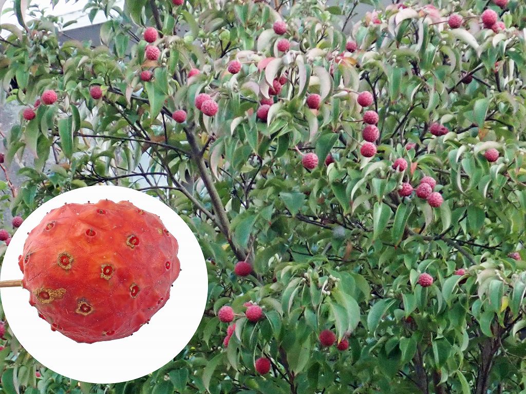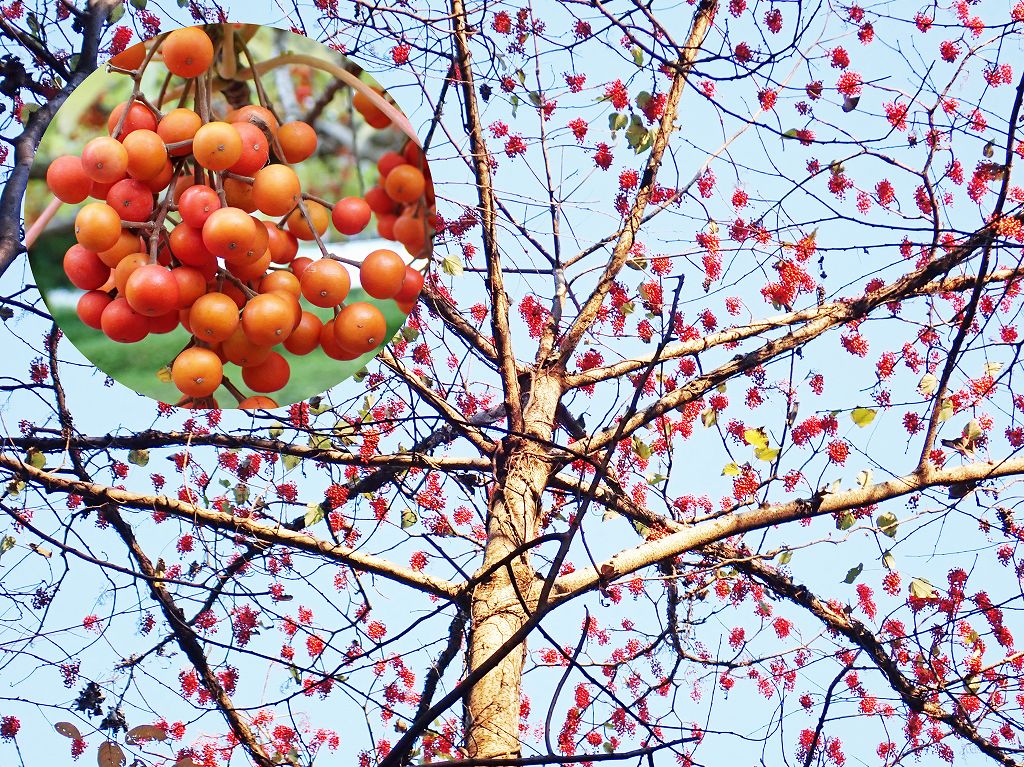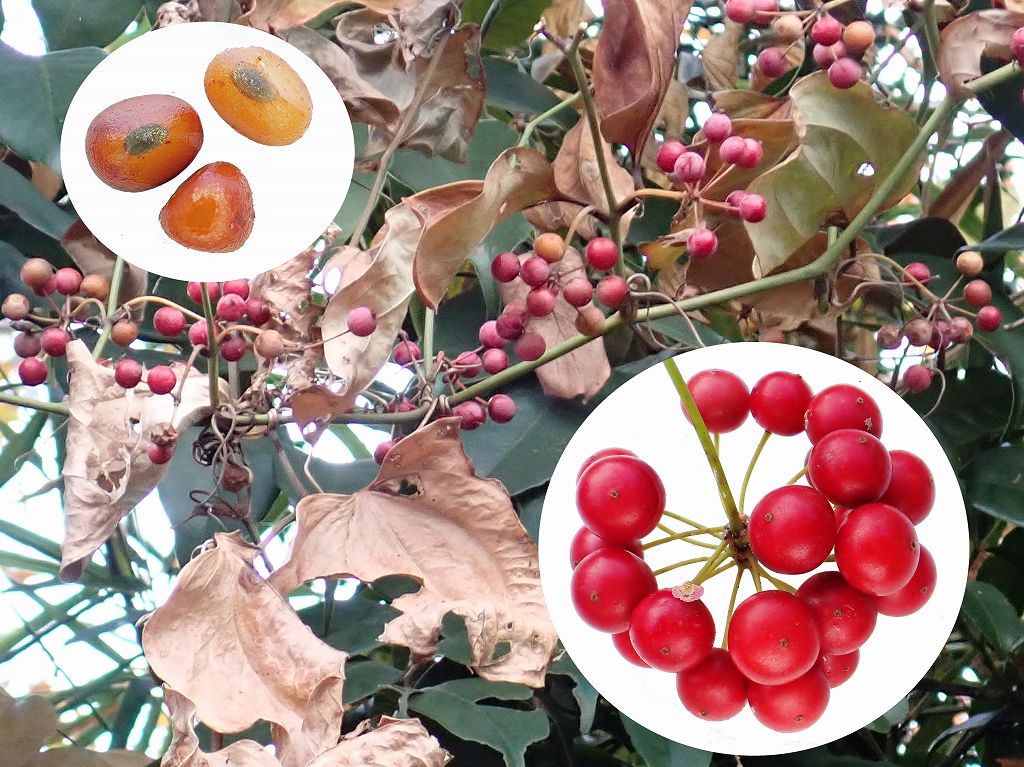 ゴンズイ実、スダジイ大木、マテバシイ実、ヤマウルシ紅葉、サンゴジュ実、アカメガシワ。