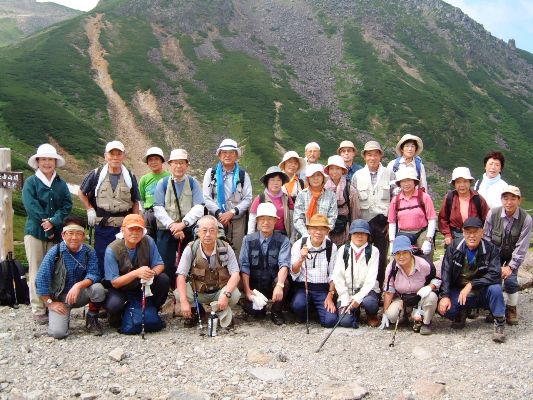 左側の朝日岳は入山禁止の標識があった。足元に注意しながら、緑のハイマツ越しに下の風景、遠くの山並みを堪能する。