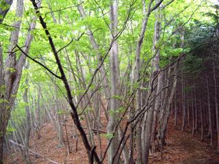 (ハンノ木尾根へ登る支尾根、新緑の山道の景色)